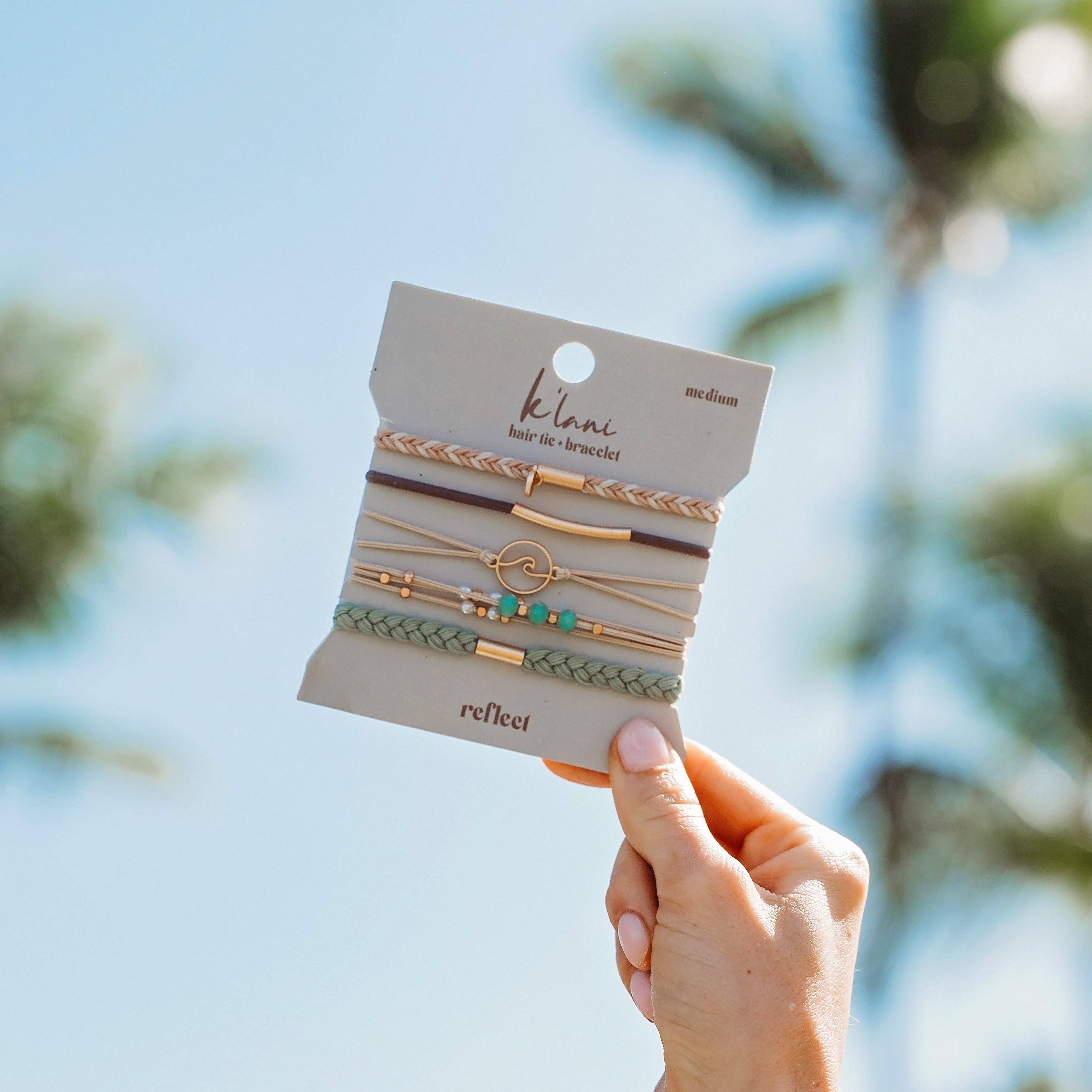 The Reflect set brings the peaceful energy of the beach to your style. These 5 hair tie bracelets are the perfect accessory made of earthy neutral and soothing green colors to remind you to calmly go with the flow as you reflect on what really matters. Medium is the size of a normal hair tie band. It fits wrists between 5-6.4" around. Small is better for younger girls and small teens. It fits wrists under 5" around. Large is sized for wrists 6.5-7.5"