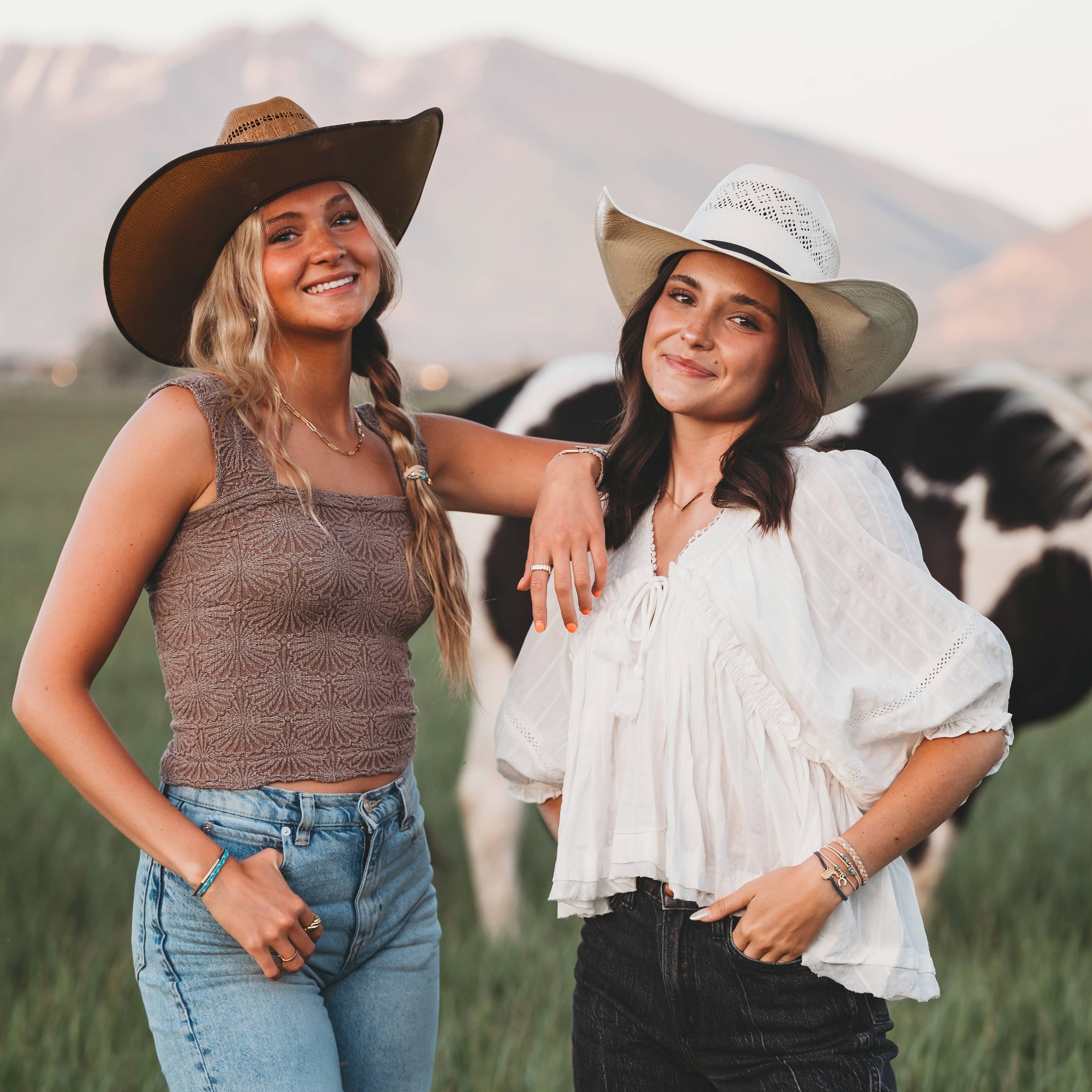 Our Stride set includes five bracelets that double as hair ties in the cutest coastal cowgirl colors of blue, brown, cream and teal. This set features dainty boot and horseshoe gold charms that will remind you to lengthen your stride and cowgirl up. Medium is the size of a normal hair tie band. It fits wrists between 5-6.4" around.  Small is better for younger girls and small teens.  It fits wrists under 5" around.  Large is sized for wrists 6.5-7.5"