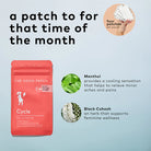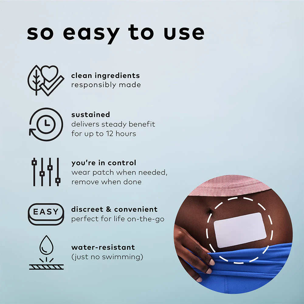 A wearable wellness patch for that time of the month. Infused with Menthol (5%) and Black Cohosh. This patch offers targeted temporary relief of minor aches and pains associated with that time of the month. Made with 4-way stretch, water-resistant fabric technology, for relief without interfering with your day.