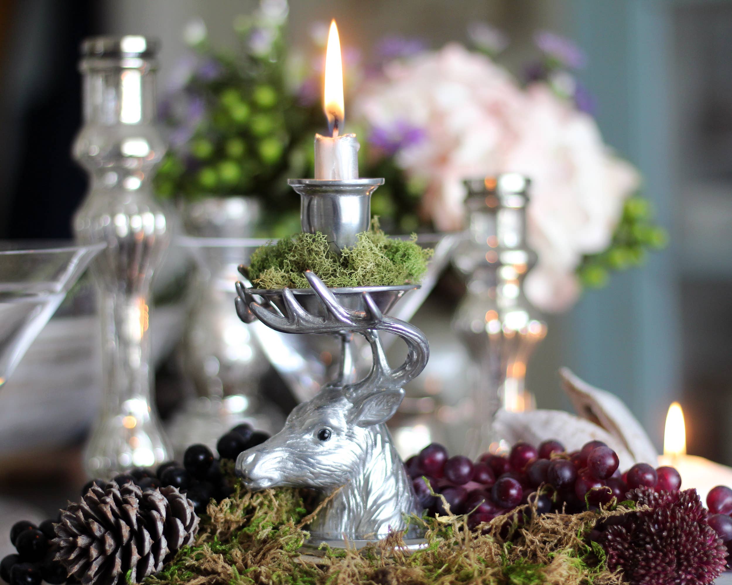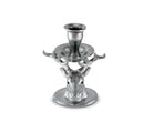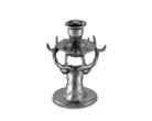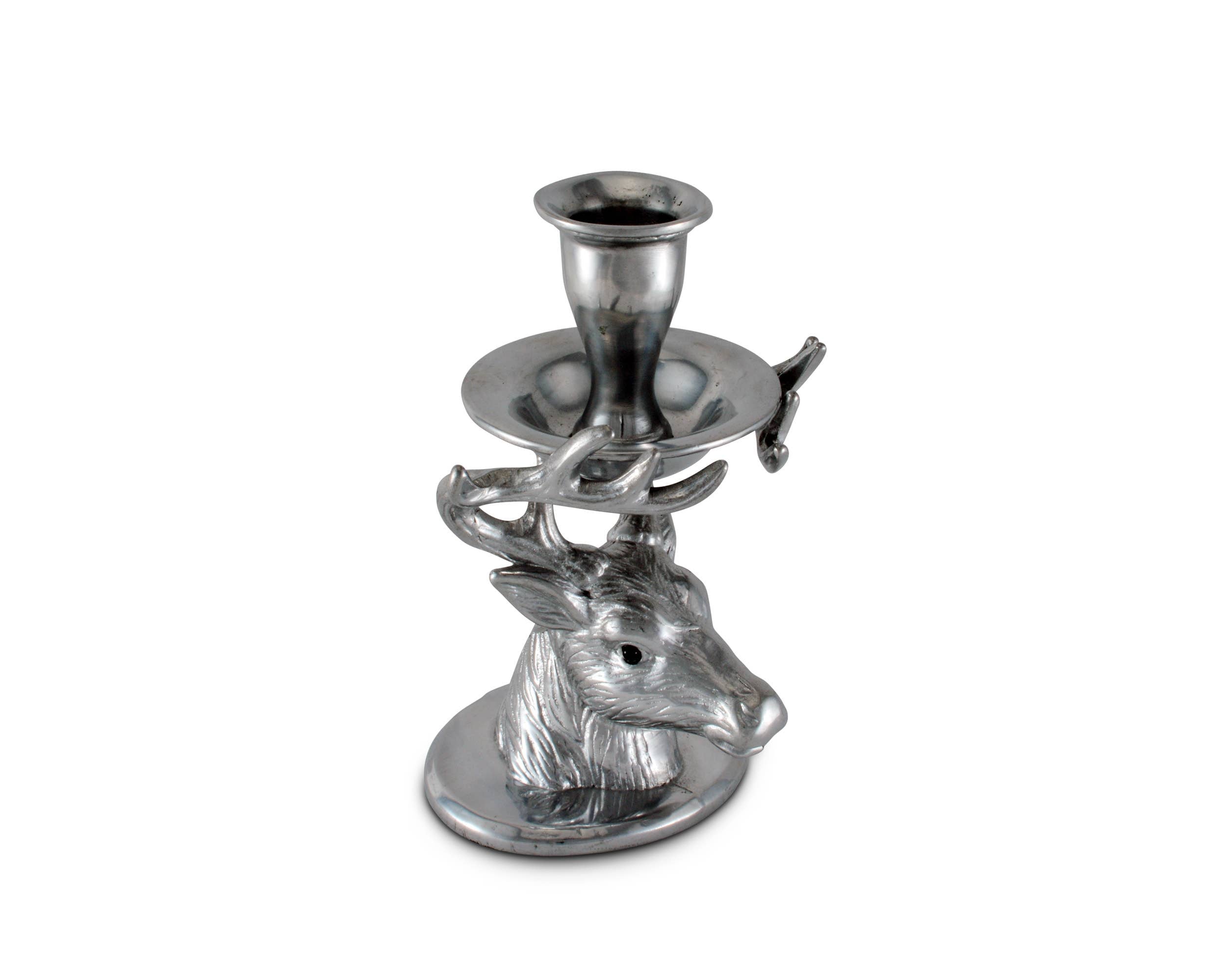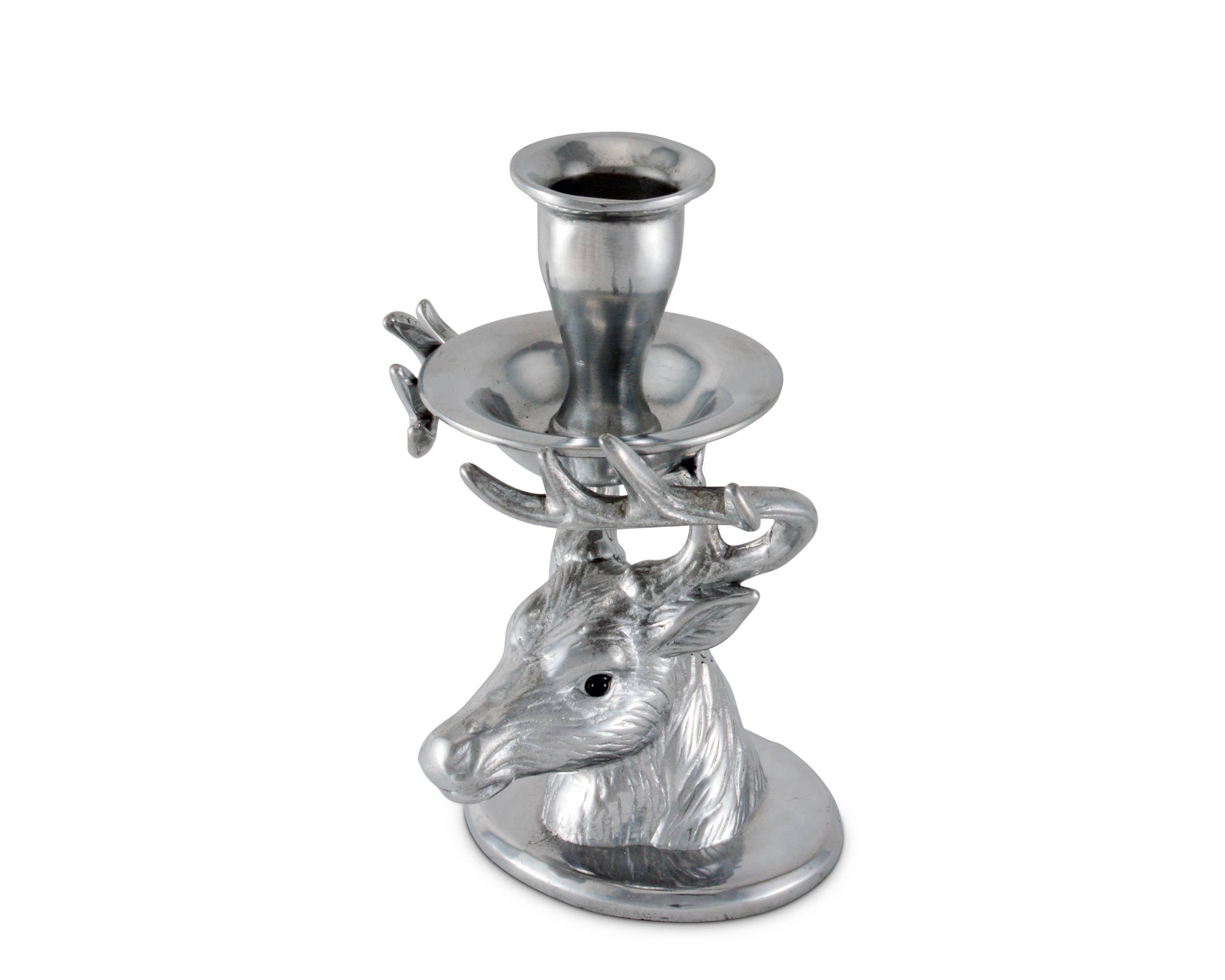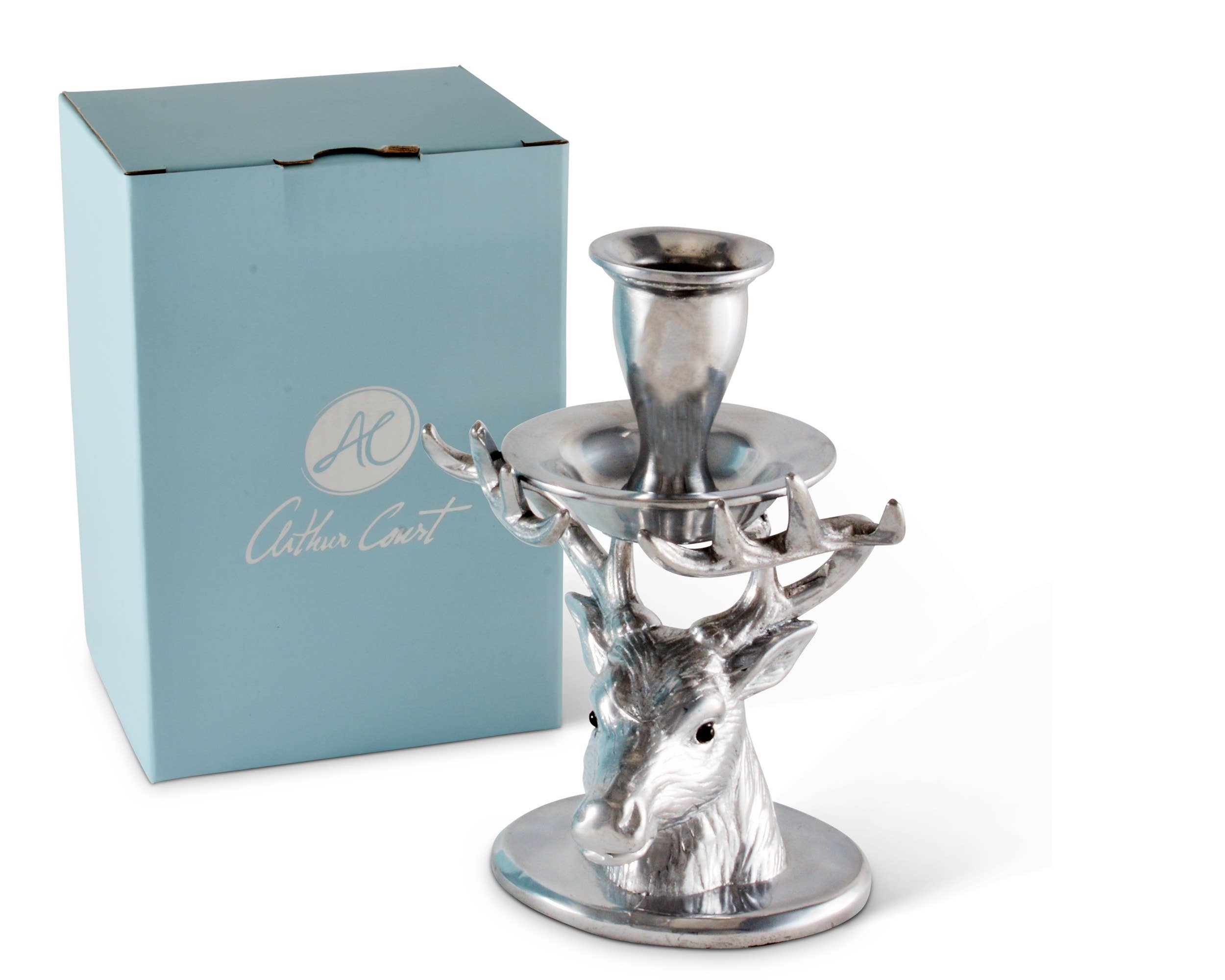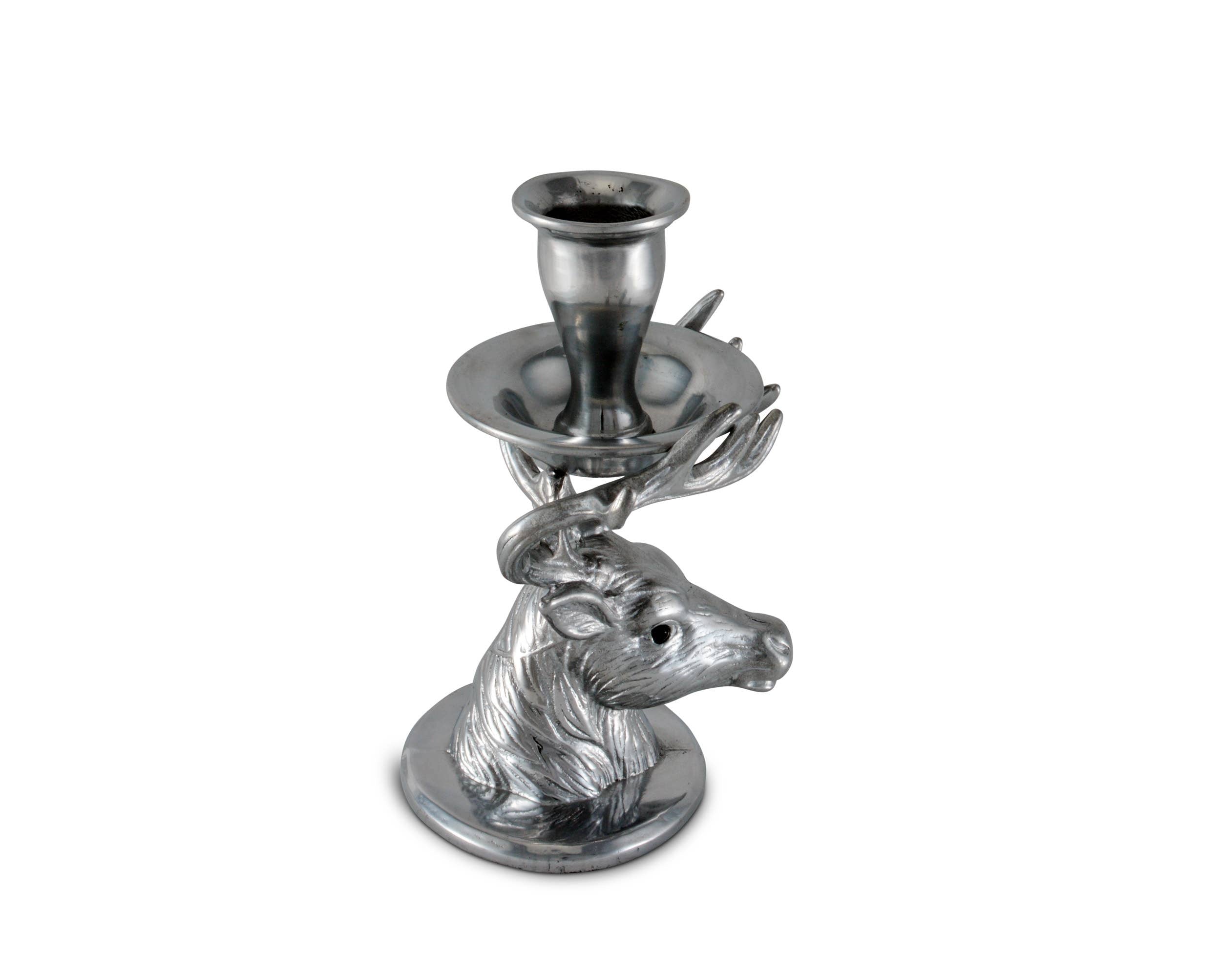 Styled after a mounted Elk head, Arthur Court’s Elk Candle Holder is a trophy design item for any room. Fine details define the Elk, ears, eyes, hide and a full royal rack of antlers support a taper candle cup with drip pan. Symbolizing strength, stamina and community, displaying this Elk figure candle holder in your home will start conversations and reward you with light and beauty. Size: 5.5" H x 4.25" W x 3.5" L Care: Dust with damp cloth. Will not tarnish.