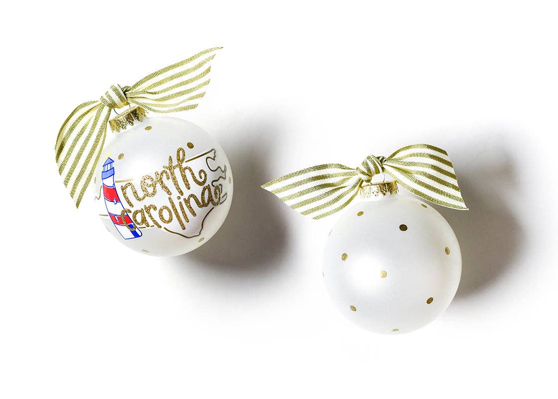 Whether used as everyday décor or to adorn the Christmas tree, the North Carolina Motif 100mm Glass Ornament is a happy way to celebrate your customers' favorite state. Featuring gold glitter lettering and adorned with a bow, this ornament is the perfect way to showcase state pride.