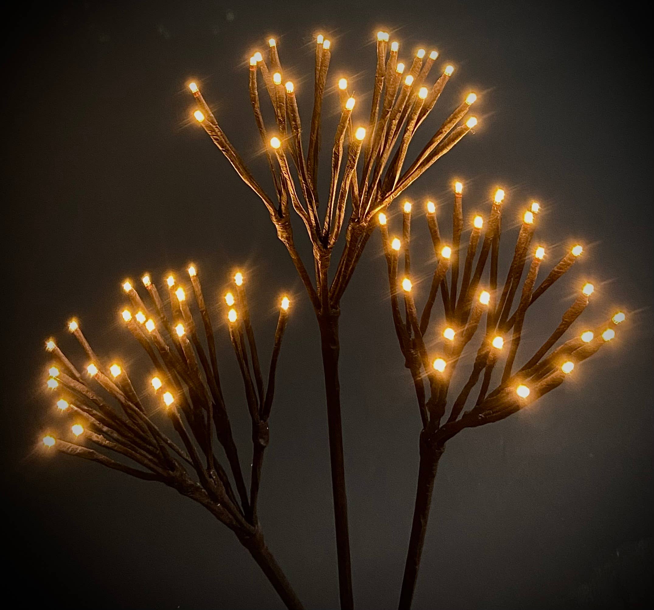 30" STARBURST WILLOW BRANCH WITH 72 LIGHT WARM WHITE LEDS Enjoy the beauty of these illuminated branches all year long. Perfect for parties, weddings or as a unique accent to add to your décor. Standard 110V electrical supply connects to a 24-Volt adapter. Convertible electric to battery with optional converter (sold separately item#184002.)