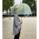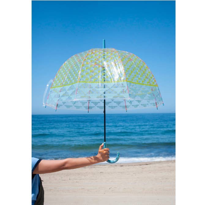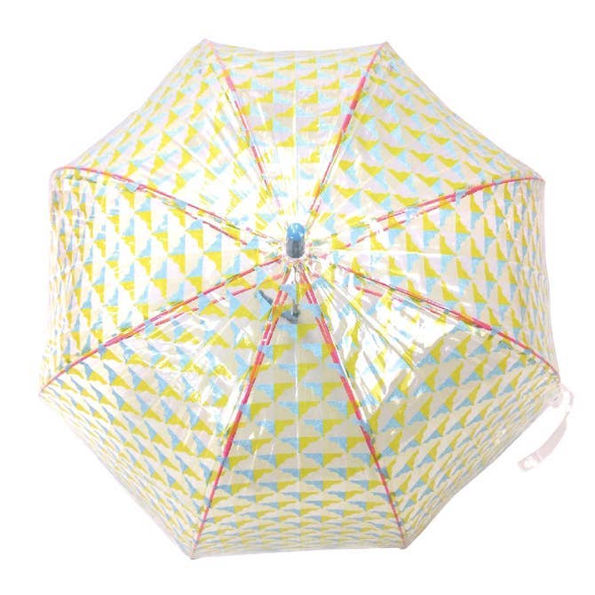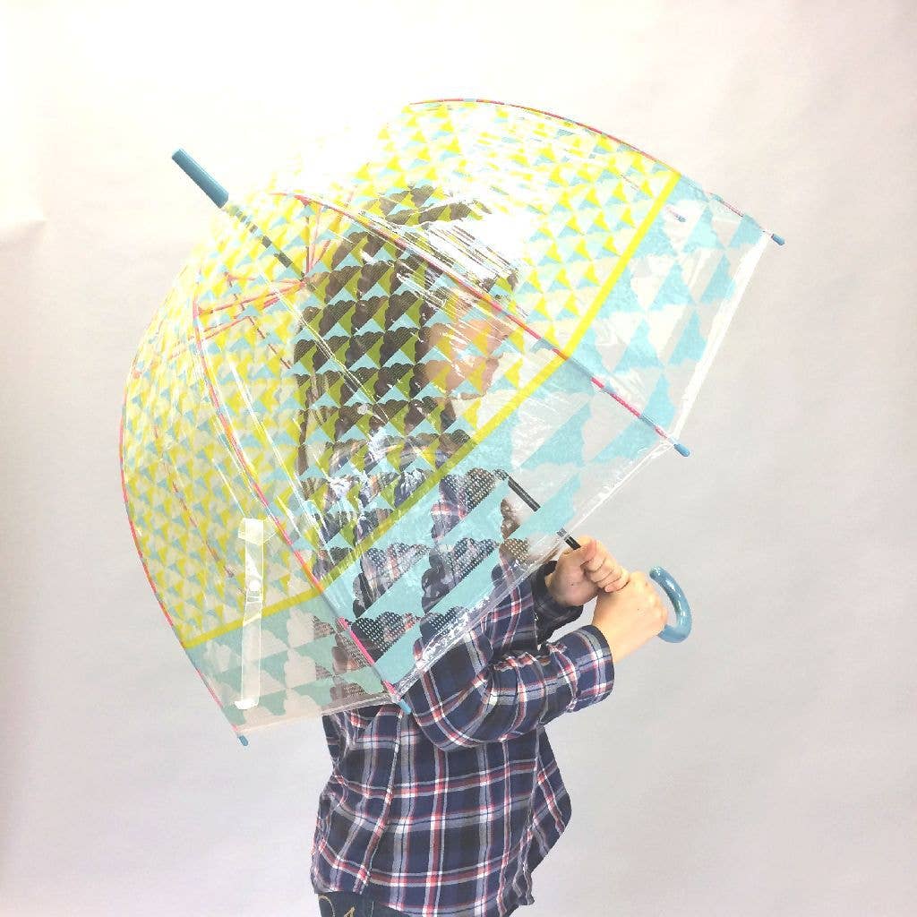 Where style meets function. Our elegantly curved frame Happy Clear Dome Umbrellas have a soft feminine silhouette. The large dome provides lots of headroom, keeping you dry from your head past your shoulders. Made from clear vinyl, you can always see where you are going. All original, colorful textured designs adorn each piece, perfect for adults of all ages. Available in three geometric patterns: Block, Stripe and Cloud. Made from premium-quality umbrella fabric, polyethylene, fiberglass. Comes with a special guard to protect fingers and nails when opening and closing.