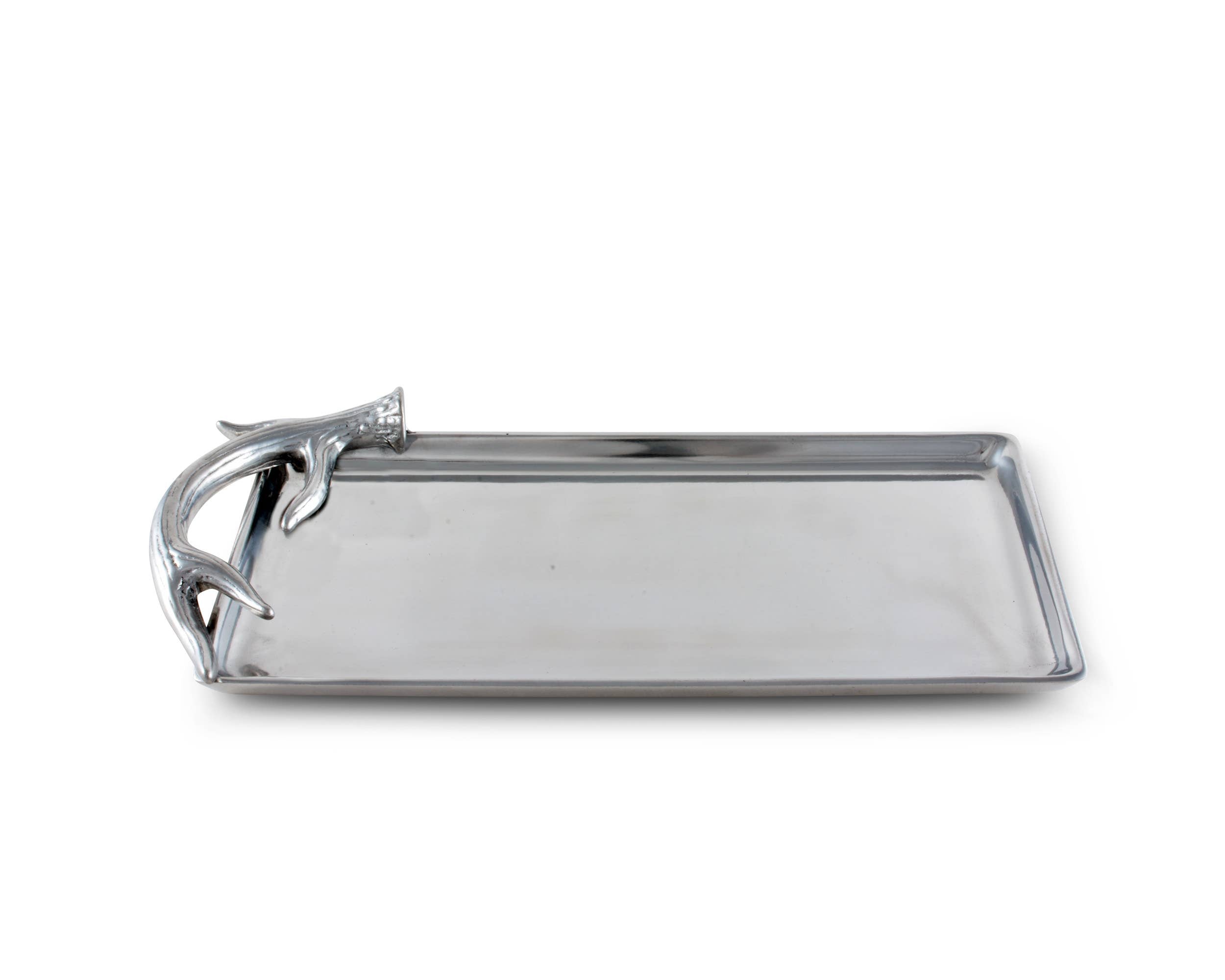 Present the polished brilliance of this 6x12 Antler Tray from Arthur Court at your next party. A realistic antler swings around the left edge of this piece to create a textured handle, which complements the interior's sleek finish. The handmade, aluminum tray is perfect for buffet-style parties, but is also tasteful enough to stand on its own. Size: L: 12.0" / W: 6.0" Care: Wash by hand with mild dish soap and dry immediately - do not put in dishwasher