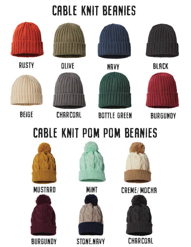 Our Elk Shed customizable graphic is a new graphic to go with our NEW BEANIES. We will customize your patch with your desired location. We offer three types of beanie, something for everyone, and many color choices to choose from. Please see the color/style chart pictured for reference. We will add your customization where "Wise River" is on the patch