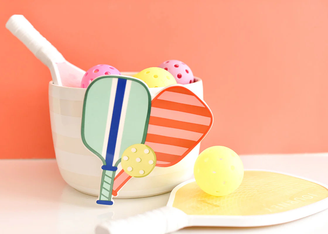 Bring some playful energy to your décor with our Pickleball Big Attachment. Featuring two brightly striped paddles and a lime green ball, this sporty design is perfect for game nights, snack tables, or adding a fun theme to your kitchen. Attach it to your favorite Big Base for an instant win in happy home décor. A great gift for any pickleball partner—and a cheerful addition to your own collection.