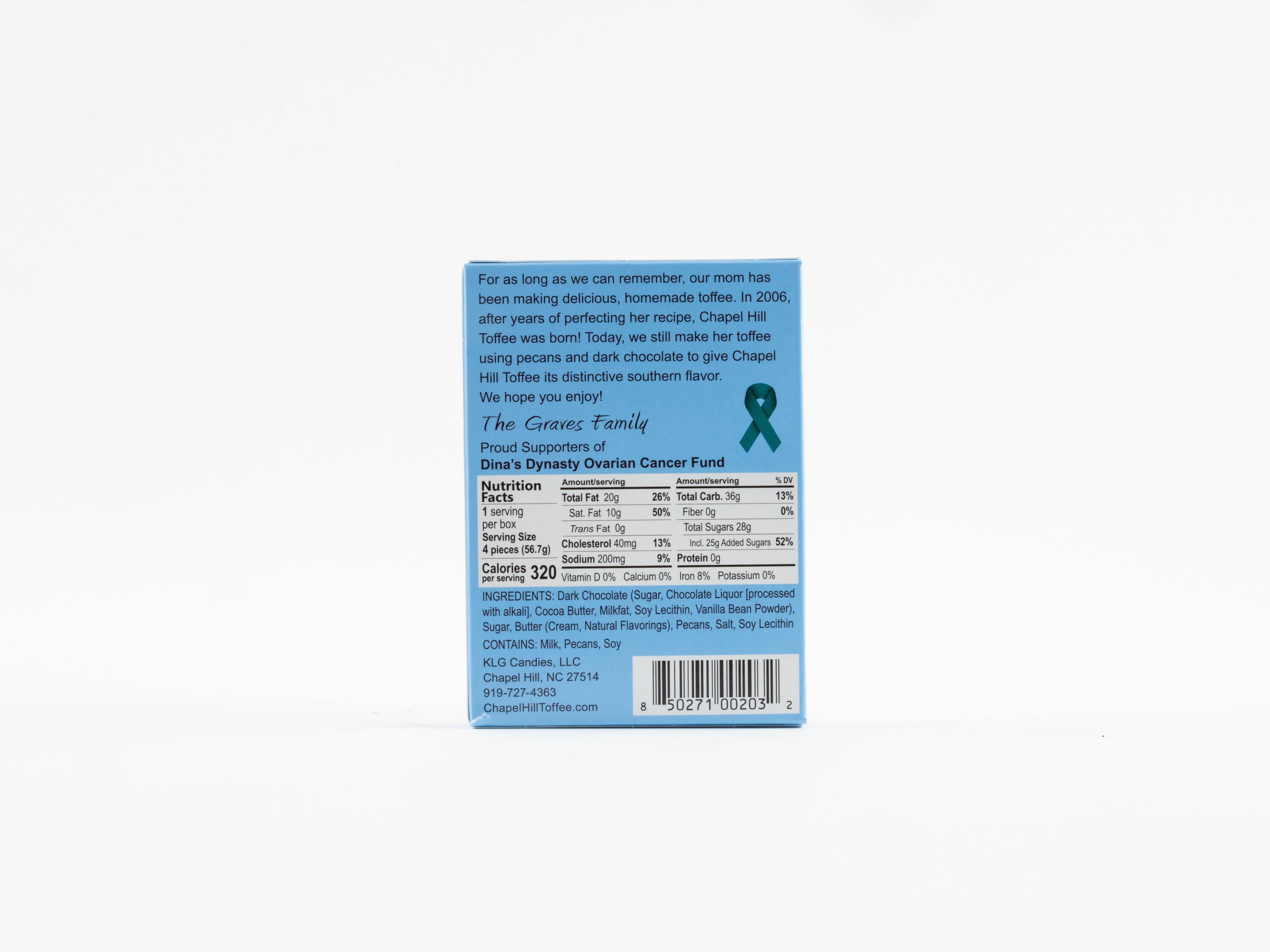 A portion of the sale of every box of toffee is donated to the Dina’s Dynasty Ovarian Cancer Fund.