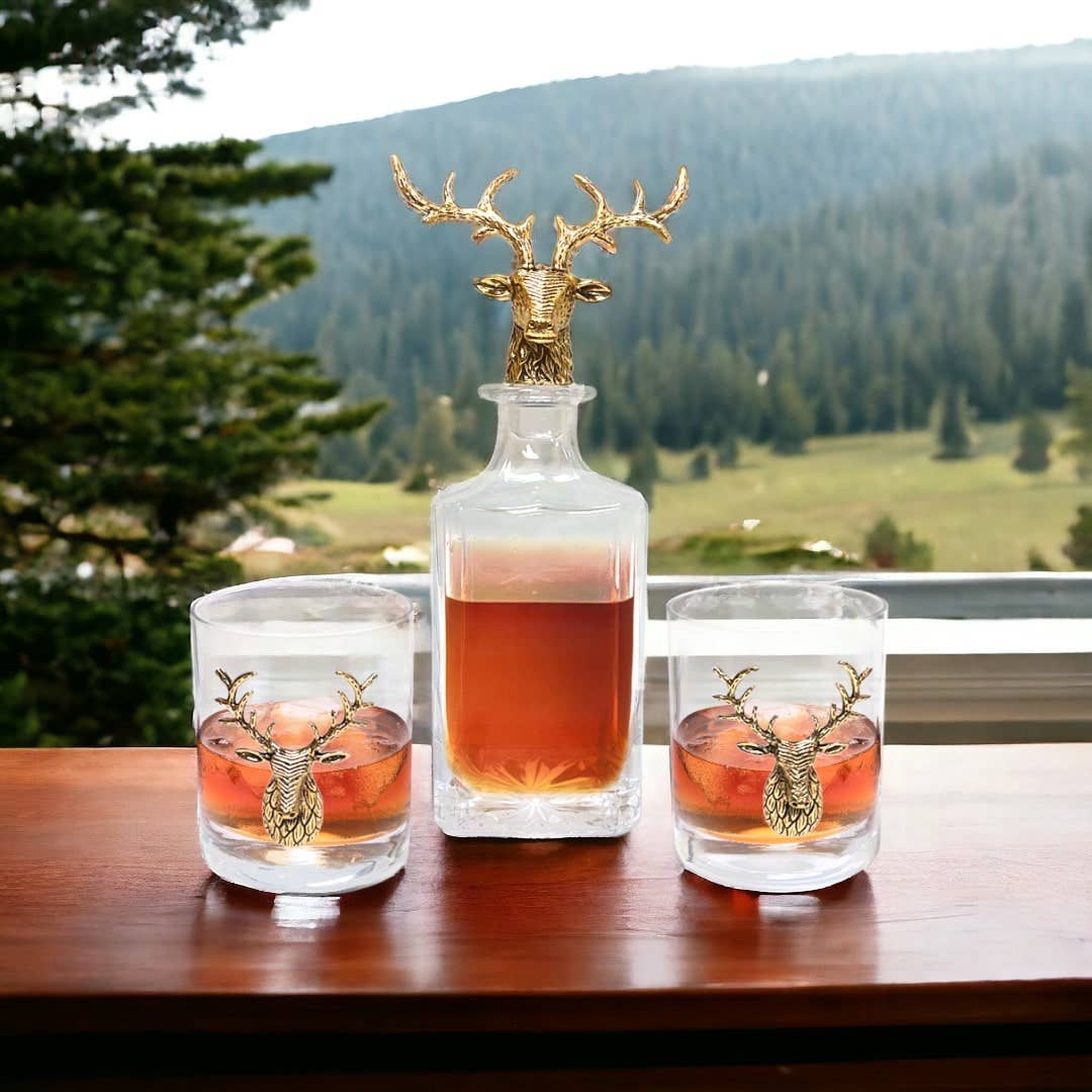 Elevate any home bar with our stag decanter and whiskey glass set, where rustic charm meets refined craftsmanship. Featuring a brass stag icon, this whiskey decanter and matching whiskey glasses are perfect for bourbon, scotch, or whisky lovers. Whether used for serving fine spirits, entertaining, or as a striking decor piece, this set enhances any hunting cabin, lodge, or whiskey collection. A perfect gift for hunters, whiskey enthusiasts, and those who enjoy premium barware.