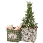 A set of two galvanized metal bins from our Christmas Collection featuring vintage deer and nature designs inspired by old world home décor. Large bin displays an all-over toile pattern of deer and trees with the small bin displaying a double-sided design of a deer and complementing green plaid. Seasonal bin set is perfect for holding household objects or Christmas seasonal décor. Greenery and accessories pictured not included. Our Deer Toile bin set includes dual side metal handles for easy carrying and nest inside each other for compact storage. A rustic seasonal home accent with a variety of display options.