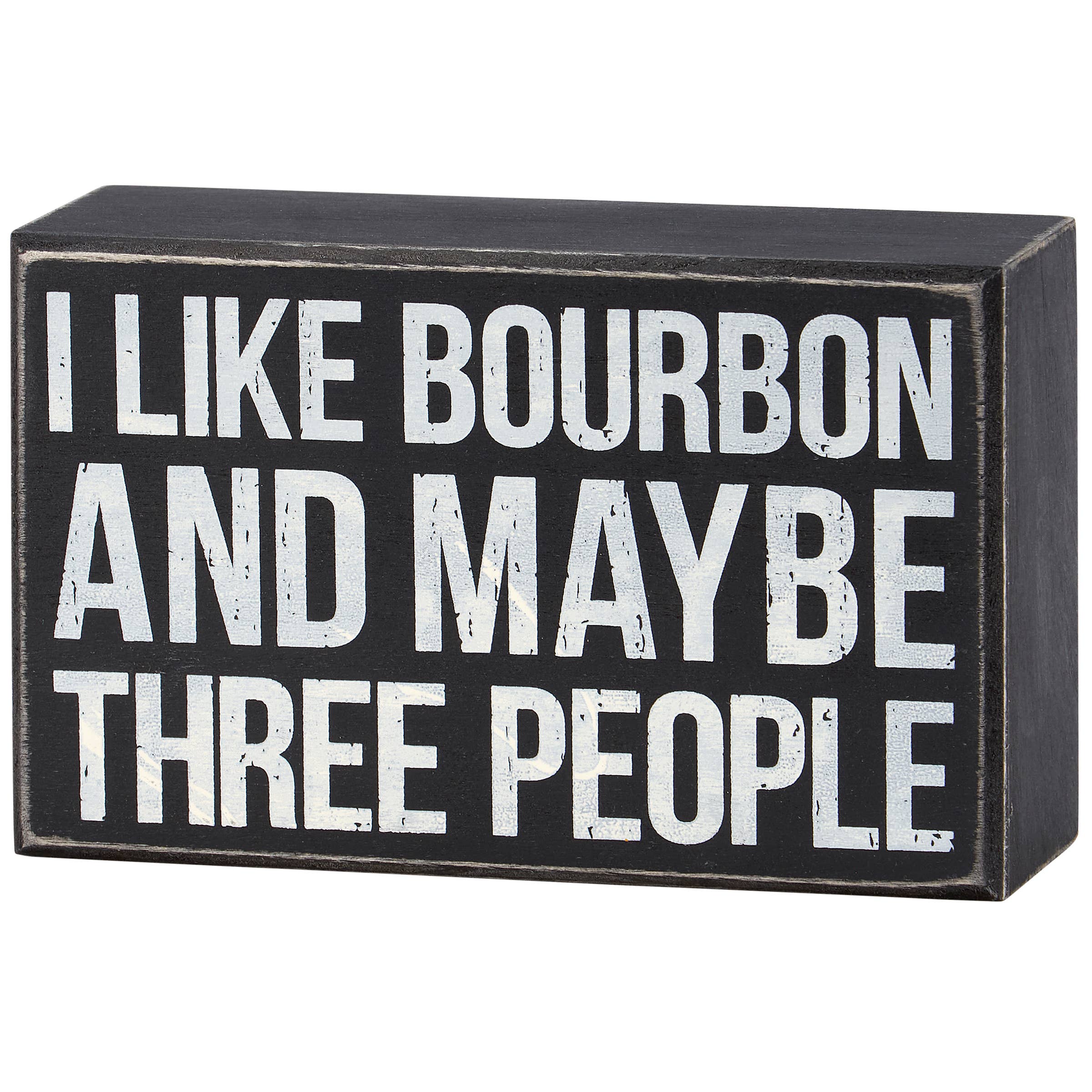 A classic black and white wooden box sign from our Box Sign Collection displaying a humorous alcohol inspired sentiment that reads "I Like Bourbon And Maybe Three People." Funny box sign features distressed details with coordinating black color on sides and back. Our I Like Bourbon box sign is easy to hang or can free-stand alone. A funny alcohol-themed gift that can be easily displayed in any home or work space.