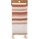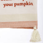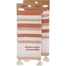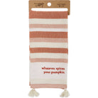 A cotton kitchen towel from our Fall & Harvest Collection features a fall-inspired color palette with embroidered "Whatever Spices Your Pumpkin" sentiment and woven stripe designs. Includes tassel accents for added interest. Towel is packaged on a cardboard hanger to easily display on rack. Our Whatever Spices Your Pumpkin kitchen towel is machine-washable.